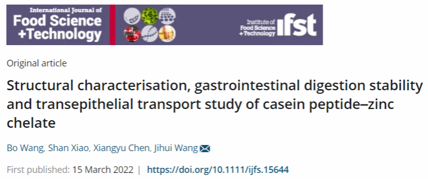 2022年3月,太阳城娱乐城化学工程与能源技术公司王波博士(第一作者)在国际食品期刊《International Journal of Food Science and Technology》(IF:3.612, 中科院二区)发表了题为“Structural characterisation, gastrointestinal digestion stability and transepithe-lial transport study of casein peptide–zinc chelate”的研究论文。