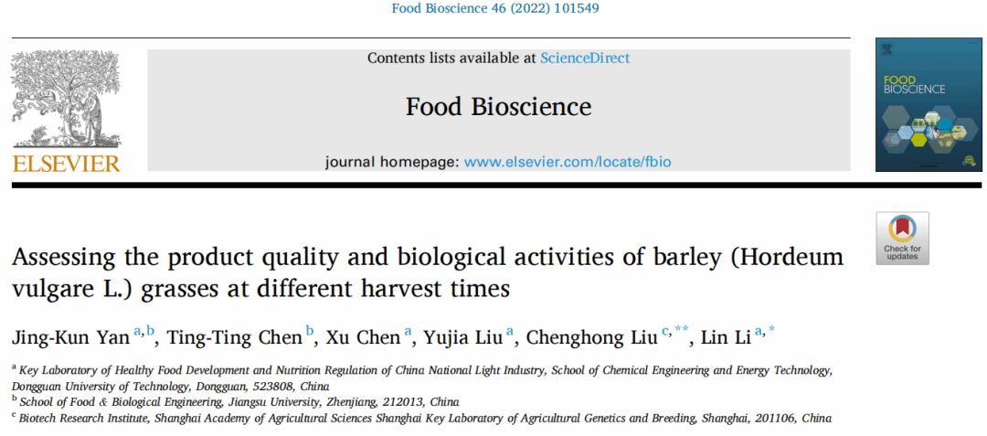 2022年3月,太阳城娱乐城食品营养健康工程与智能化加工研究中心闫景坤教授(第一作者)在国际食品期刊《Food Bioscience》(IF: 5.318, 中科院二区)发表了题为“Assessing the product quality and biological activities of barley (Hordeum vulgare L.) grasses at different harvest times”的研究论文。