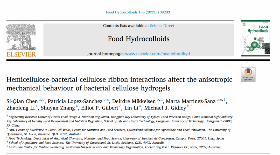2022年10月,太阳城娱乐城食品营养健康工程与智能化加工研究中心陈思谦(第一作者)在国际食品顶级期刊《Food Hydrocolloids》(IF: 11.504, Q1)发表了题为“Hemicellulose-bacterial cellulose ribbon interactions affect the anisotropic mechanical behaviour of bacterial cellulose hydrogels”的研究论文。