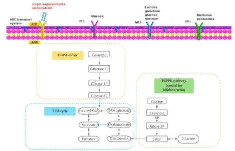 摄入杂多糖能促进双歧杆菌定植,重塑人体肠道菌群。杂多糖不能被人类基因组中编码的酶完全降解,大多数的杂多糖到达大肠中被肠道微生物降解。双歧杆菌属是在人类胃肠道中关键肠道微生物之一,能代谢各种结构复杂的多糖,包括:阿拉伯木聚糖、魔芋葡甘聚糖、n-聚糖、果胶、O-GalNAc聚糖等杂多糖,能够生成短链脂肪酸(SCFAs)、乳酸等代谢产物,有助于双歧杆菌属的定植、调节肠道菌群、增强人体免疫力、减少过敏反应等。然而,双歧杆菌对杂多糖的代谢途径、肠道菌群调节机制和人体健康调节作用尚未明确。