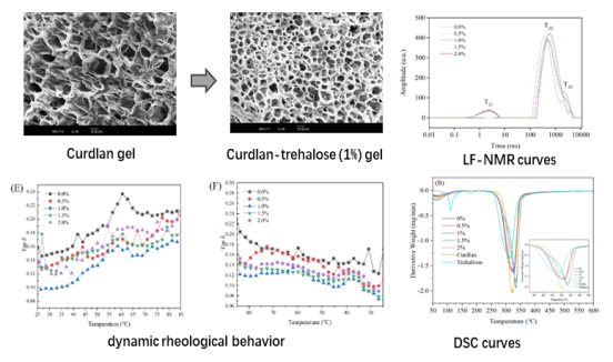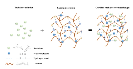 本文研究了不同海藻糖添加量对可得然胶凝胶特性的影响。结果表明,海藻糖浓度为1.0 %时,可得然胶-海藻糖复合凝胶的凝胶性能最佳,凝胶强度达到峰值,且具有良好的持水性、吸水速率和冻融稳定性。同时,研究揭示,海藻糖的加入增强了可得然胶与海藻糖之间的氢键相互作用,从而形成更加致密的复合凝胶网络(图1)。本研究将有助于拓宽可得然胶作为胶凝剂在冷冻食品中的应用,并为可得然胶-海藻糖复合凝胶在健康食品领域的应用提供理论参考。