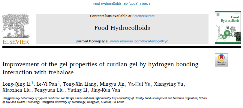 2024年9月20日,公司闫景坤教授团队于国际学术期刊《Food Hydrocolloids》(中科院JCR 1区)在线发表题为“Improvement of the gel properties of curdlan gel by hydrogen bonding interaction with trehalose”的研究性文章。论文第一作者为李垄清副研究员,公司2022级食品质量与安全专业本科生潘乐怡为共同第一作者,通讯作者为闫景坤教授。
